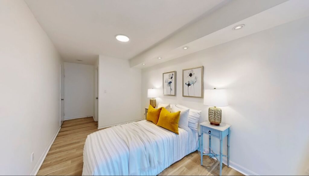 The primary bedroom is spacious, bright, and private. There’s room for a proper bed with nightstands and space to move around. Oh, and did we mention the walk-in closet? Yeah, that’s rare too. The view is south-facing onto a quiet courtyard—so no Bay Street noise, just calm vibes and good sleep.