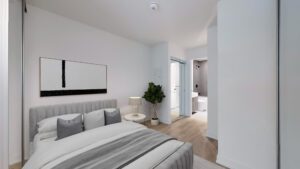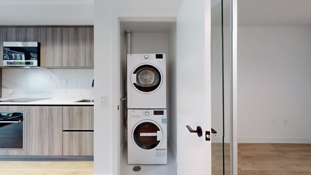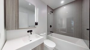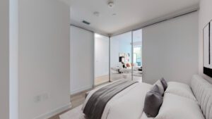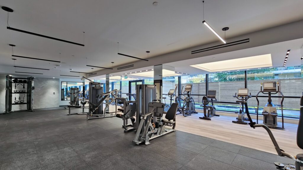 The spacious bedroom features sliding glass and pocket doors—let the natural light flood in or enjoy your privacy when you want it. The washroom is ultra-fresh with seamless built-in storage and matte black fixtures. Say goodbye to gym memberships with the fully equipped gym and yoga studio right at home.