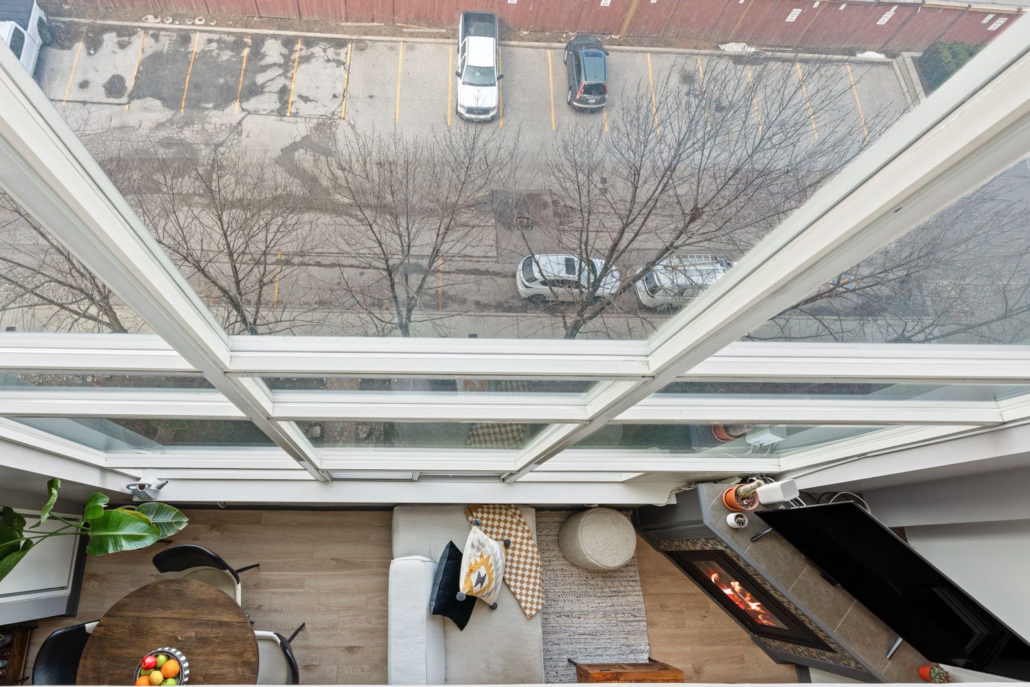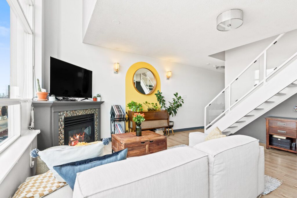 It’s giving: two-level loft, wall of windows, gas fireplace, and “wait… this is actually cool.”