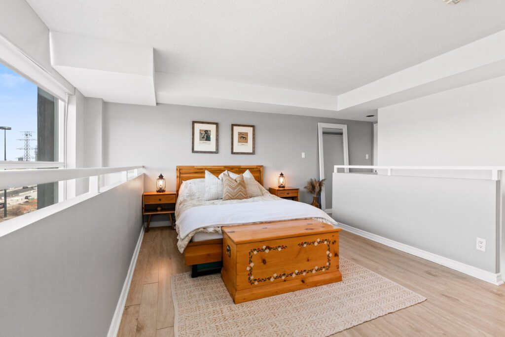 Upstairs, the bedroom keeps that open loft feeling while still giving you some breathing room from the main level. You’ve got two closets, upper-level laundry, and rare extra storage that is genuinely useful in real life. And yes, the automatic blinds are a very nice touch, because windows this good should not come with daily inconvenience.