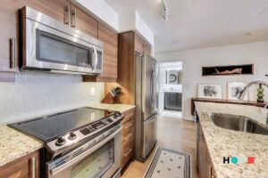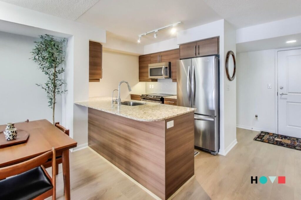The kitchen is polished and practical with stone counters and stainless appliances. The bathroom brings spa vibes with quartz and porcelain finishes. And with five elevators and 24/7 concierge, the day-to-day here is smooth and easy.